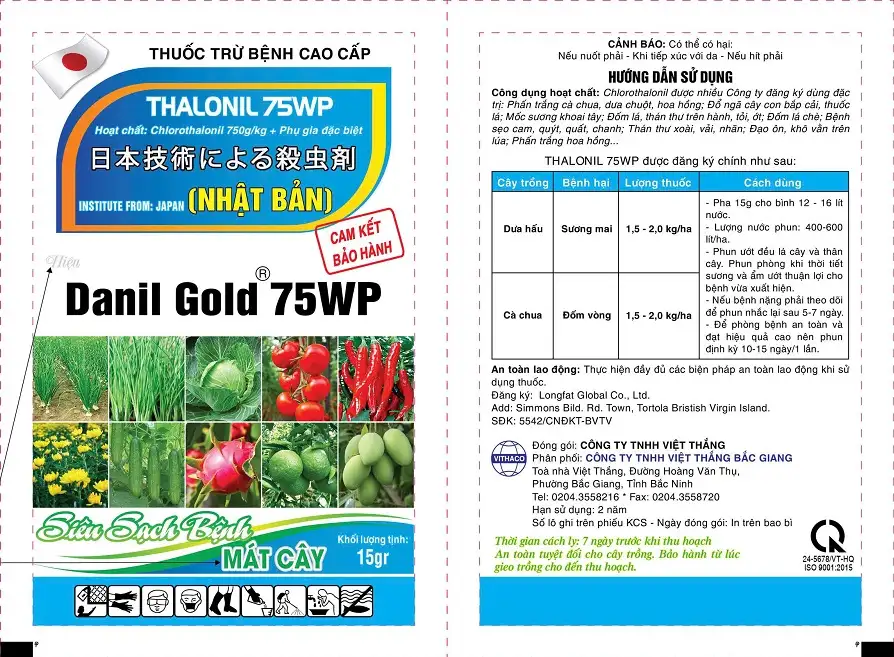 Thuốc trừ bệnh cây trồng Danil Gold 75WP là thuốc trừ nấm bệnh sinh học có dạng bột hòa nước. Với thành phần chính Chlorothalonil – một hoạt chất trừ nấm hiệu quả và có phổ diệt trừ rộng, hoạt động bằng cách can thiệp vào hệ thống enzyme của nấm đến mức không thể thực hiện được các chức năng thiết yếu liên quan đến sự phát triển.