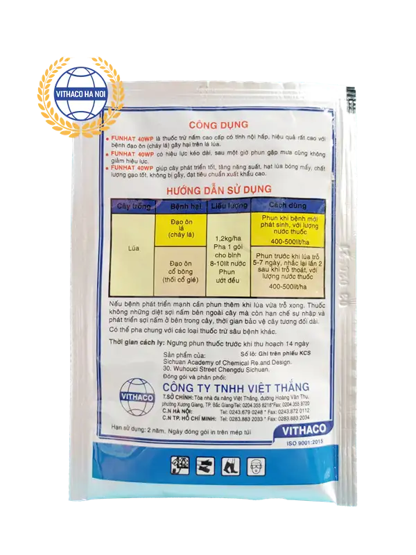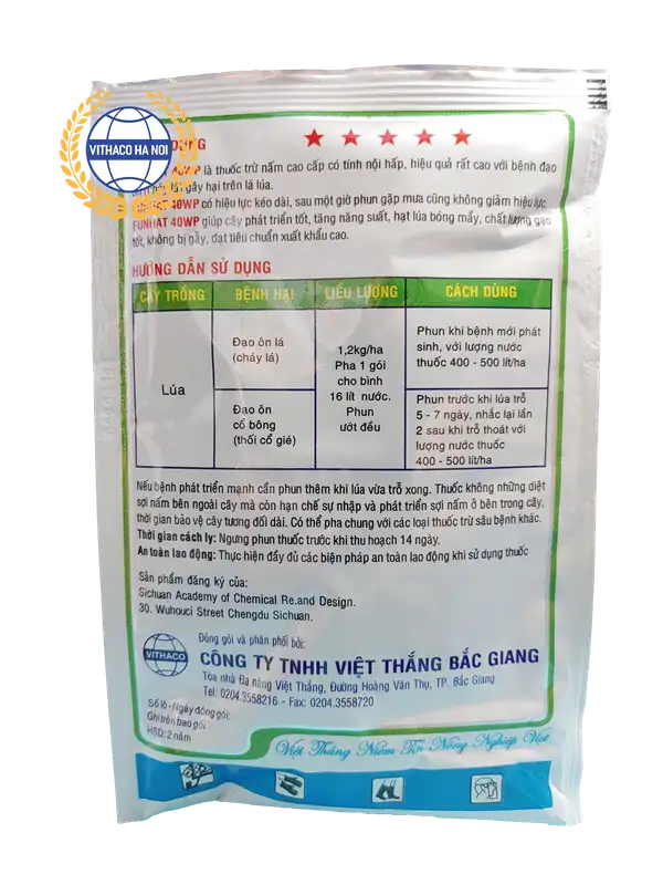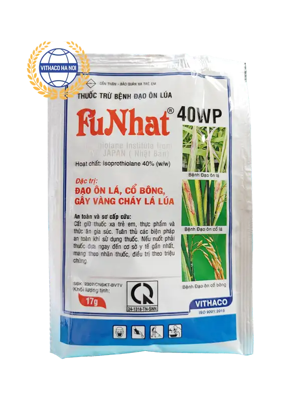 Thuốc trừ bệnh FuNhat 40WP là thuốc trừ nấm cao cấp có tính nội hấp, hiệu quả rất cao với bệnh đạo ôn (cháy lá) gây hại trên lá lúa.