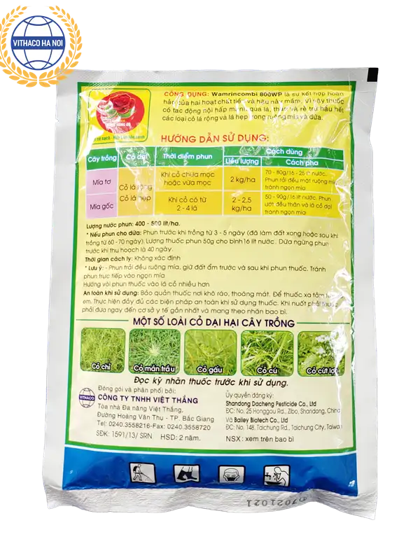 Thuốc trừ cỏ Wamrincombi 800WP là thuốc trừ cỏ hỗn hợp, có tính chọn lọc, nội hấp, hút qua rễ và lá, trừ cỏ tiền nảy mầm và hậu nảy mầm, trừ nhiều loại cỏ hàng năm và cỏ bụi trên ruộng mía và dứa (thơm), an toàn đối với mía và dứa (thơm).